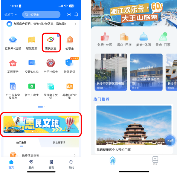 登陆“湘易办”后,在首页搜索服务名称,或在金刚区及banner处点击“惠民文旅”,便可进入服务。