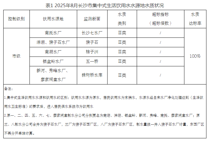 2025年8月长沙市集中式生活饮用水水源地水质状况